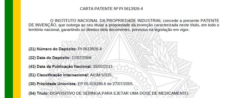[2] INSTITUTO NACIONAL DA PROPRIEDADE INDUSTRIAL (INPI). Carta Patente nº PI 0613926-4. Dispositivo de seringa para ejetar uma dose de medicamento. Titular: Novo Nordisk A/S. Data do depósito: 17 jul. 2006. Data de publicação: 15 fev. 2011.